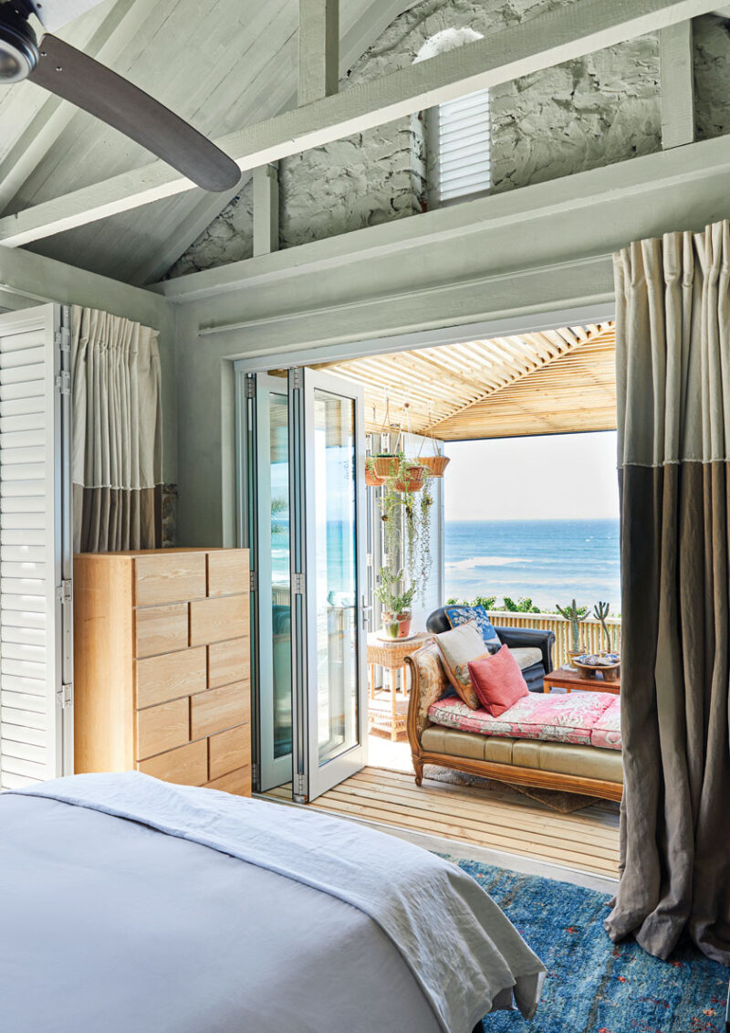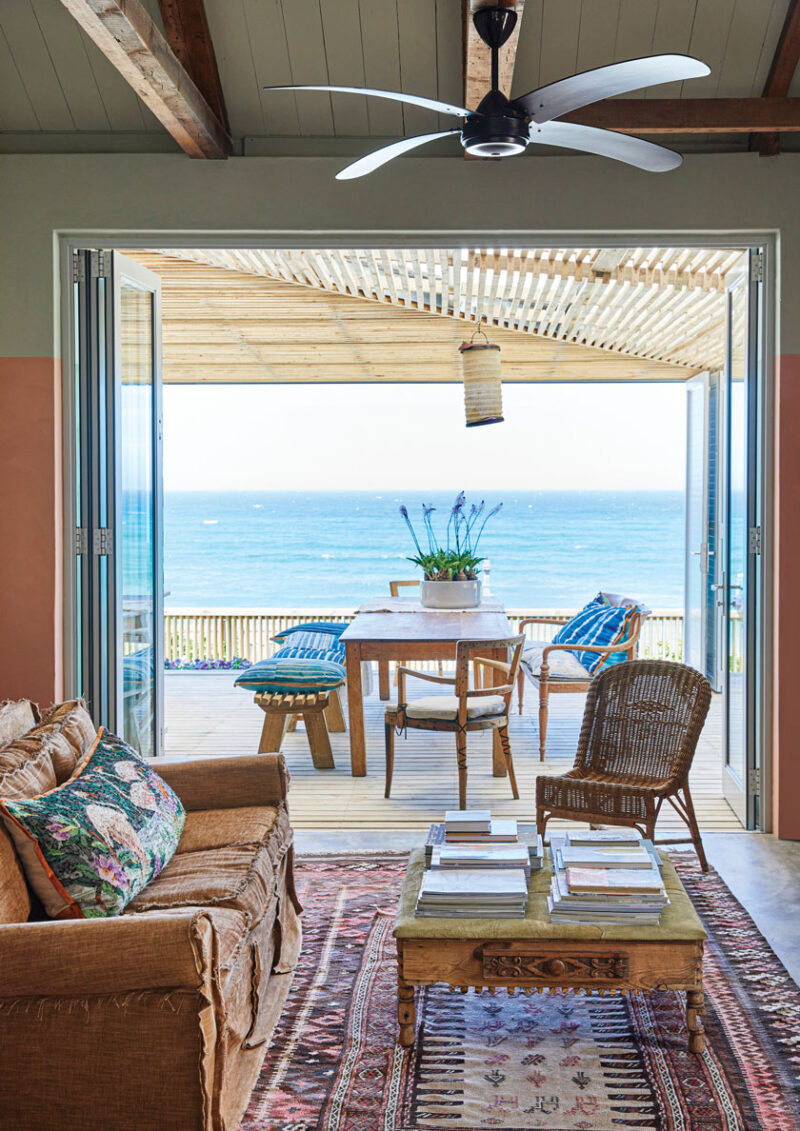 However, most of the doors and windows were too weather-beaten to be salvaged. With the passage reassigned and the entrance door closed, they opened the front of the cottage, adding a sweep of double-glazed glass and shifting the entrance. The dreamy seaside cottage’s kitchen and dining area now flow onto a deck that delivers outside dining, comfortable spots for siestas and unwavering views of the Indian Ocean. Filtered light comes from the budget-friendly wood batten used to create the pergola.
