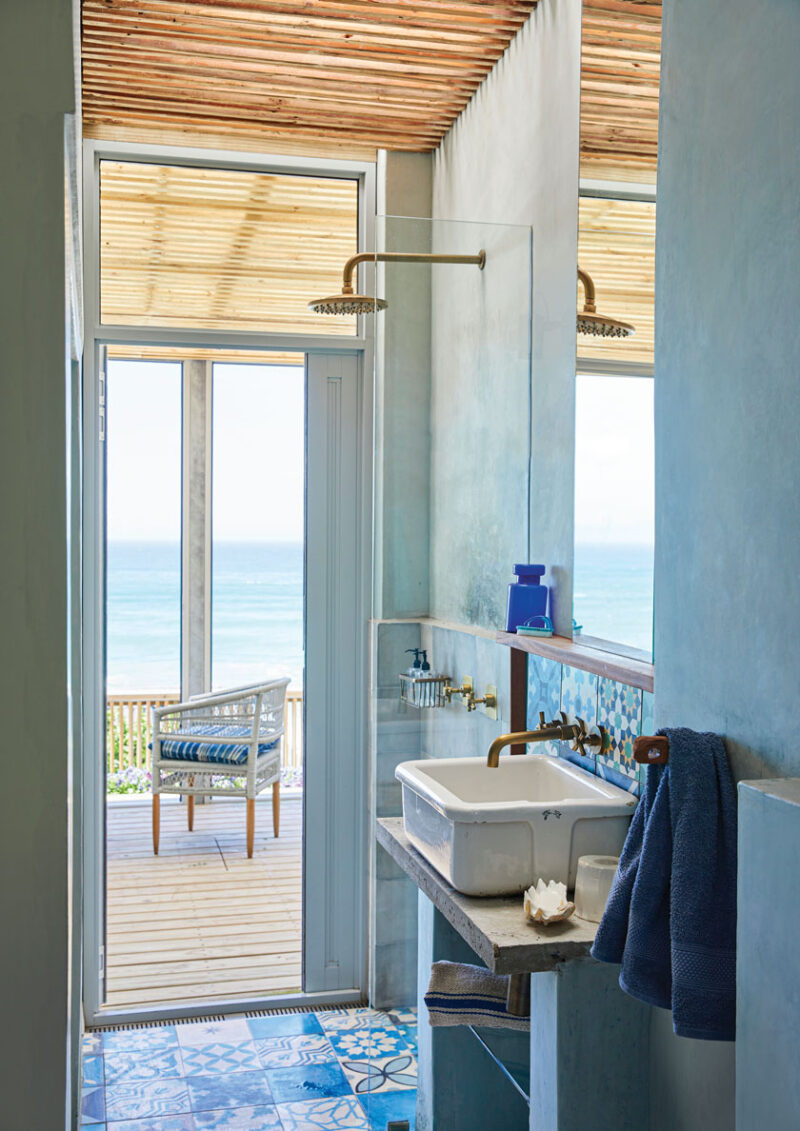 A game-changing deck was added to capture the prized views and add livability and space to the footprint, but internally, space was still at a premium. In a bold—but brilliant—move to solve this issue, Erwee and Willemse reconfigured the interior by slotting bathrooms into what was an unnecessary passage hallway, Dané explains. The row of three bathrooms that now separate the bedrooms from the living area save immense space.