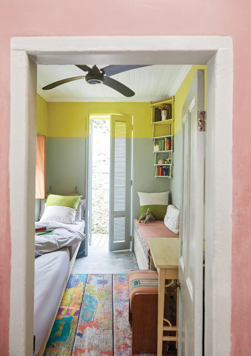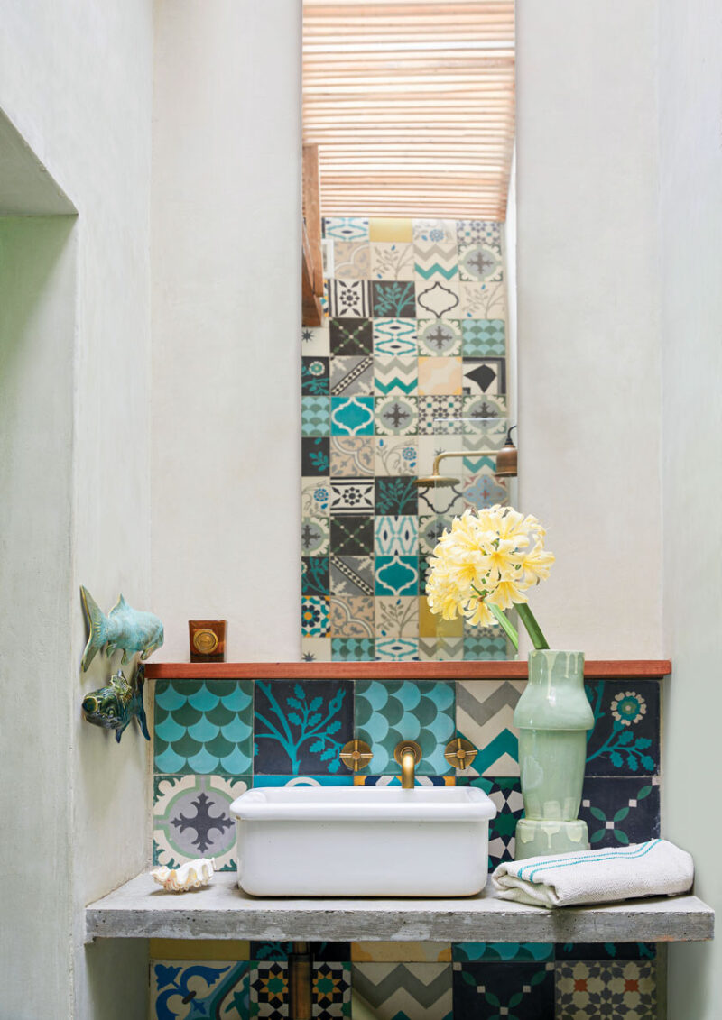 Embracing the quirky design decision, they upcycled sash windows, installing them above the bathroom doors to invite light in and inject a touch of whimsy. The walls were washed with Crete stone tinted with pigment into warm pink, olive green and soft blue. Moroccan tiles in the bathrooms in complementary shades make for a fun threshold between the bathrooms and the living area.