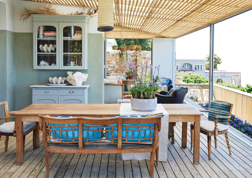 However, most of the doors and windows were too weather-beaten to be salvaged. With the passage reassigned and the entrance door closed, they opened the front of the cottage, adding a sweep of double-glazed glass and shifting the entrance. The dreamy seaside cottage’s kitchen and dining area now flow onto a deck that delivers outside dining, comfortable spots for siestas and unwavering views of the Indian Ocean. Filtered light comes from the budget-friendly wood batten used to create the pergola.