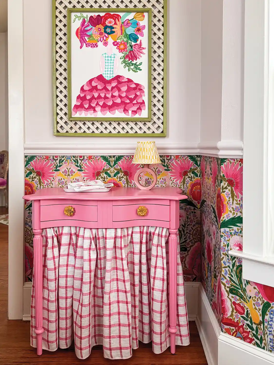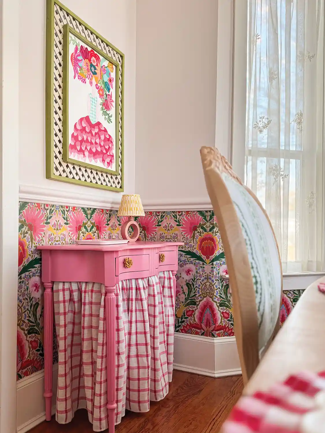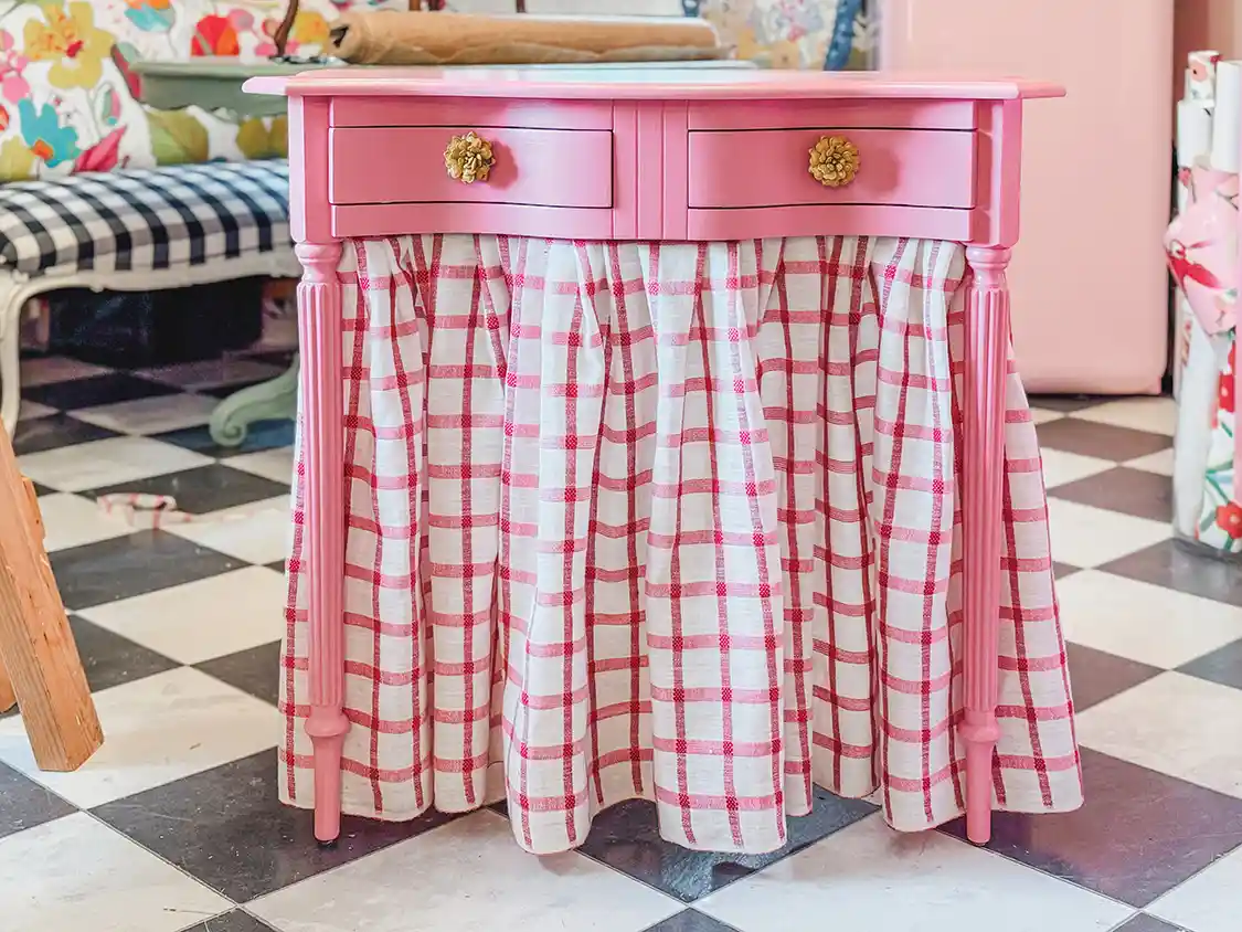 I started by priming and painting the table in Impatient Pink by Sherwin-Williams, a happy color that instantly brightened the piece. For the skirt, I chose a lightweight white, red, and pink plaid—because nothing says cottage quite like checks. After measuring from the floor to the underside of the table, I hemmed the fabric with washable fabric glue.