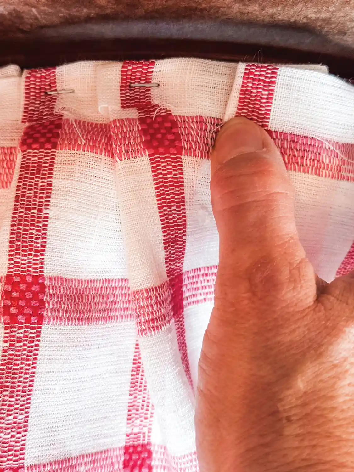 Here’s the moment the table started transforming—when the skirt began taking shape. Those red and pink checks brought instant charm and warmth.