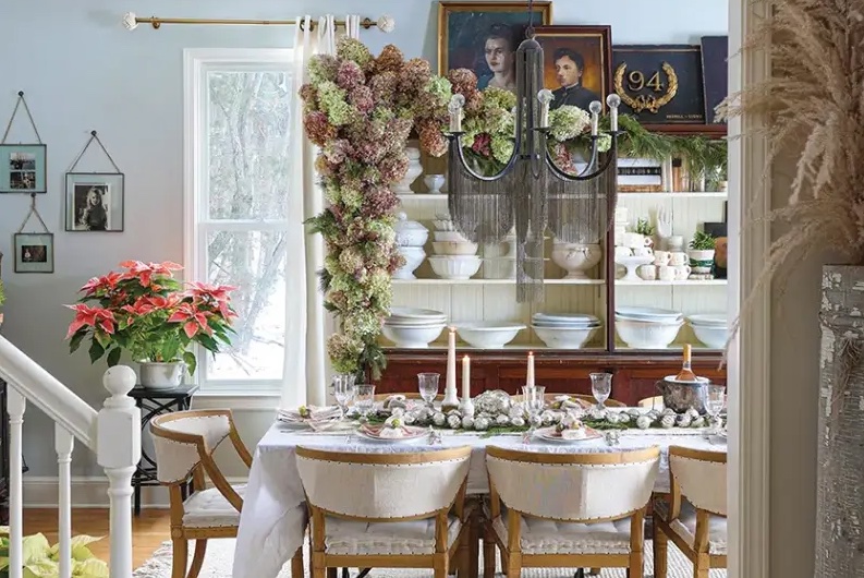 If you want to make your home special for the holidays but don’t want a cookie cutter look, find inspiration from this hydrangea installation in the lovely home of Kari Boetsch, curator, collector and creator.