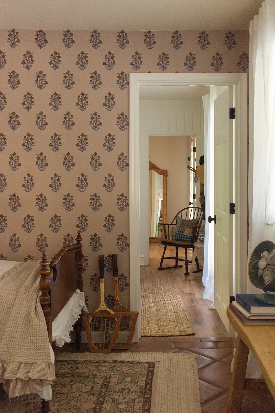 The guest room is the perfect example of Jess’s whimsical nostalgic cottage style. “The guest room immediately felt like it wanted to be a kids’ space, so I leaned into that idea by sourcing a pair of beautiful antique twin spindle beds that perfectly complement the block-print wallpaper by Chasing Paper,” she says. “A vintage-inspired brass ceiling light, an old secretary desk and layers of ruffled white bedding all contribute to the room’s charming, Old World character. Some of my favorite details are the playful accessories — a pair of vintage tennis rackets, a basket of well-loved children’s books and a layered Turkish rug, which give the room personality and warmth. Overall, it’s playful and inviting enough for kids, yet refined enough to feel just right for adults too.”