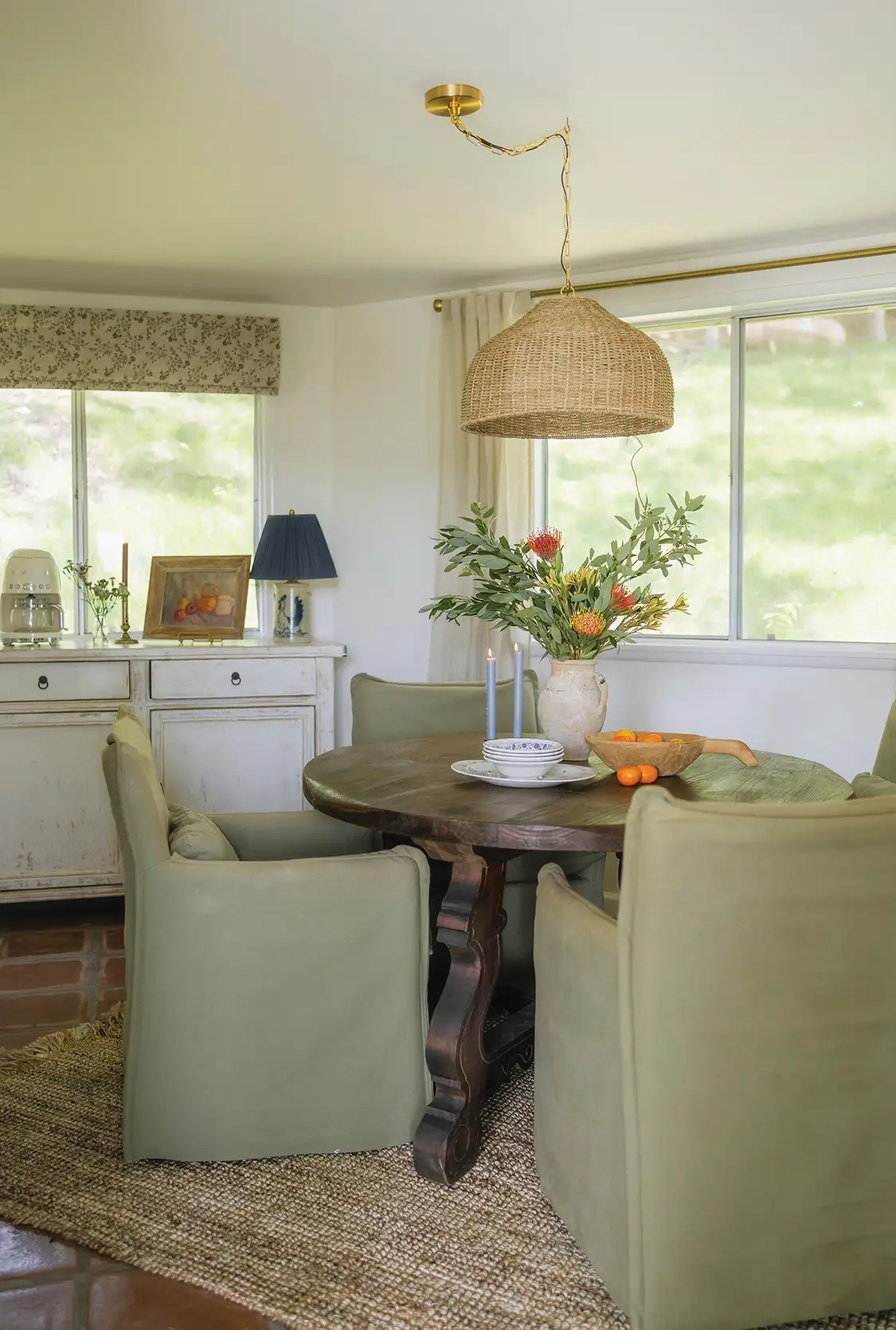 Jess introduced her favorite vintage-design elements to get the collected-over-time ambience she envisioned for the rooms. “To achieve the nostalgic cottage look, we leaned into vintage details, warm textures and pieces with soul,” she says. “We styled the rooms with curated touches like vintage plates and dinnerware, nostalgic wallpaper, vintage rugs and charming Smeg appliances that are a nod to the past while still being functional for modern life. Throughout the space, you’ll find old oil paintings, an antique Windsor chair and timeworn décor with authentic patina and history — elements that give the cottage a collected, storied feel. Layered with antique furniture, rustic lamps, pattern on pattern textiles and cozy throws, the result is a space that’s as perfect for a family weekend as it is for a group of girlfriends looking for an authentic Santa Ynez getaway.”
