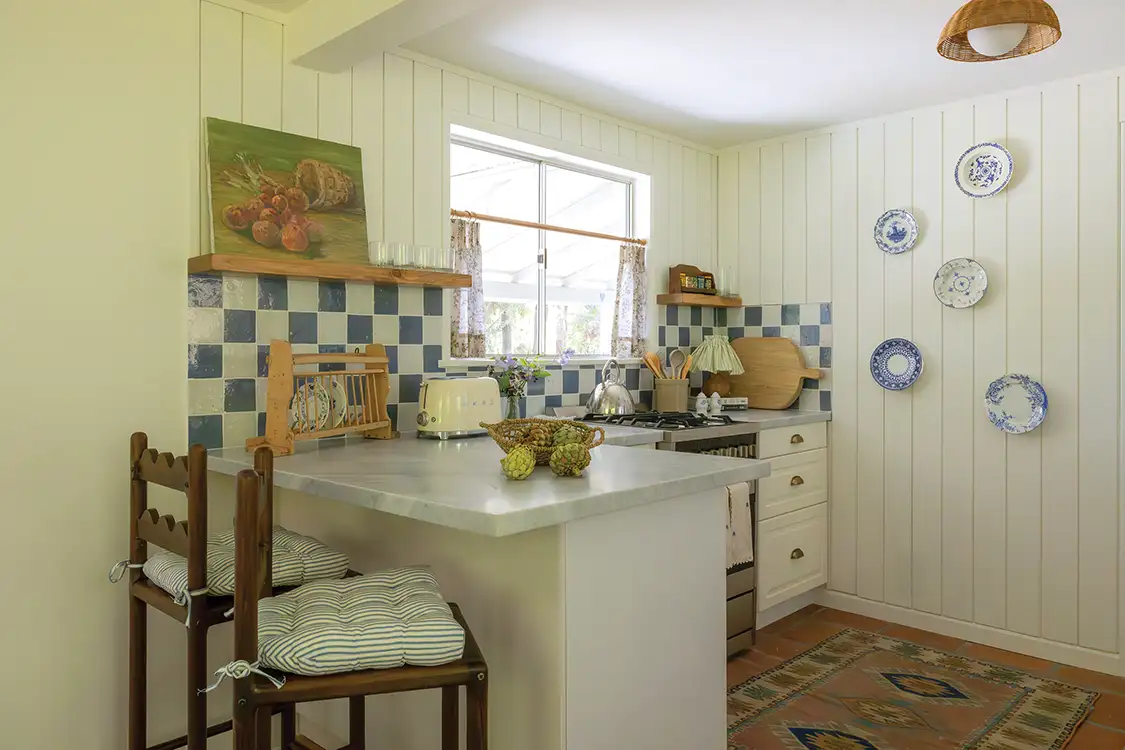 Jess’s first impressions of the guest cottage were its breathtaking scenic views along with areas that could benefit from some design elements that would bring it up to the level of its surroundings. “When you first pull up to the cottage, it’s impossible not to be struck by the sweeping views of the Santa Ynez Valley; they really set the tone for what makes this property so special,” she says. “The cottage itself was small and quirky, with original Saltillo tile floors and charming French doors that opened out to the porch and that incredible landscape. The spaces, including the kitchen and bathroom, weren’t in bad shape, but they felt a little flat; they were missing that cozy storybook quality I really wanted to bring to life. One of the most special things about this property is its truly rare vantage point. There are only a handful of homes in this neighborhood, so just a few share the perspective of looking back into the Santa Ynez Valley from the mountainside. It’s a view that feels both expansive and intimate at the same time. You can see a neighboring pond and old, established trees close by, which give the landscape a cozy, almost nostalgic, feeling. The whole scene feels like a warm hug: grounding and peaceful, but also incredibly magical!”